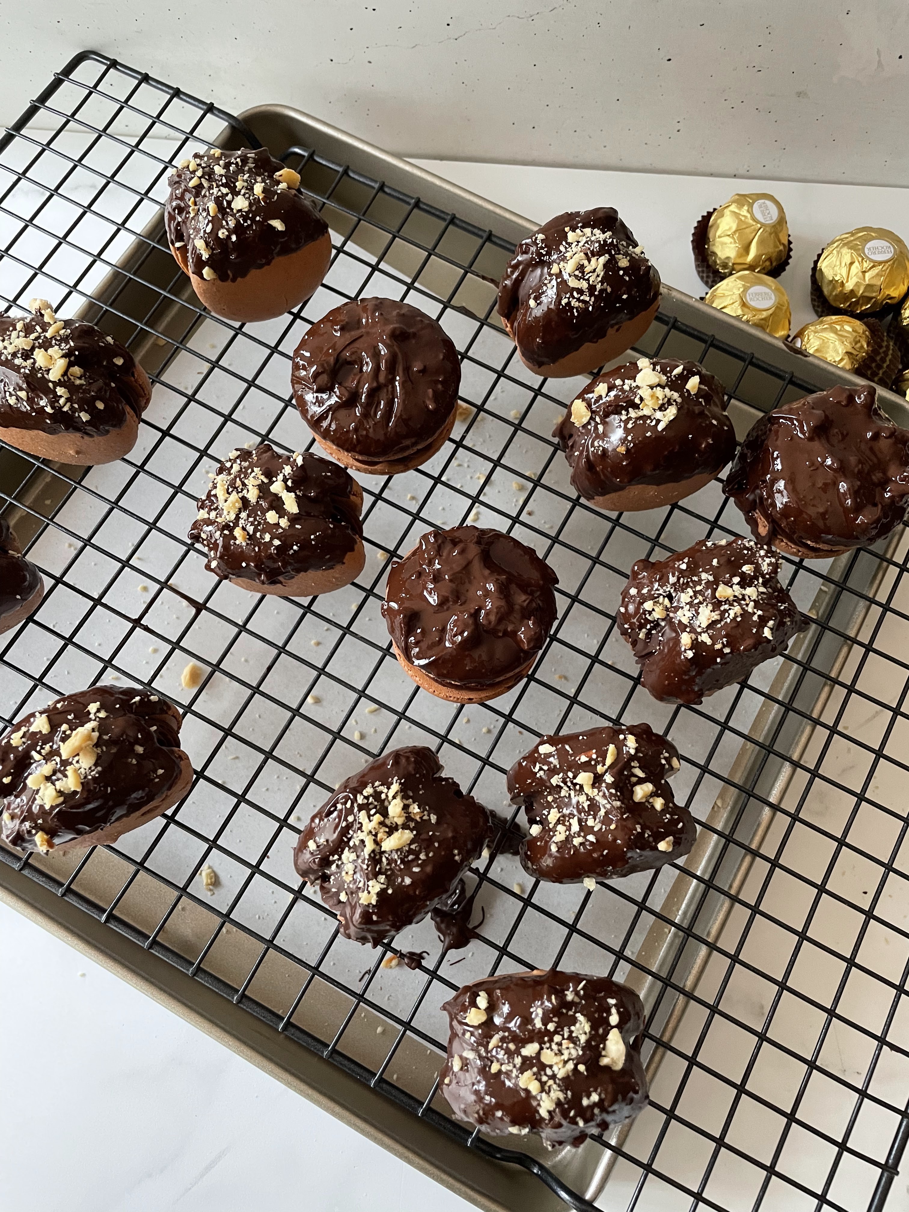 - Remove the macarons from the fridge and dip just the tops in the hazelnut and melted chocolate.