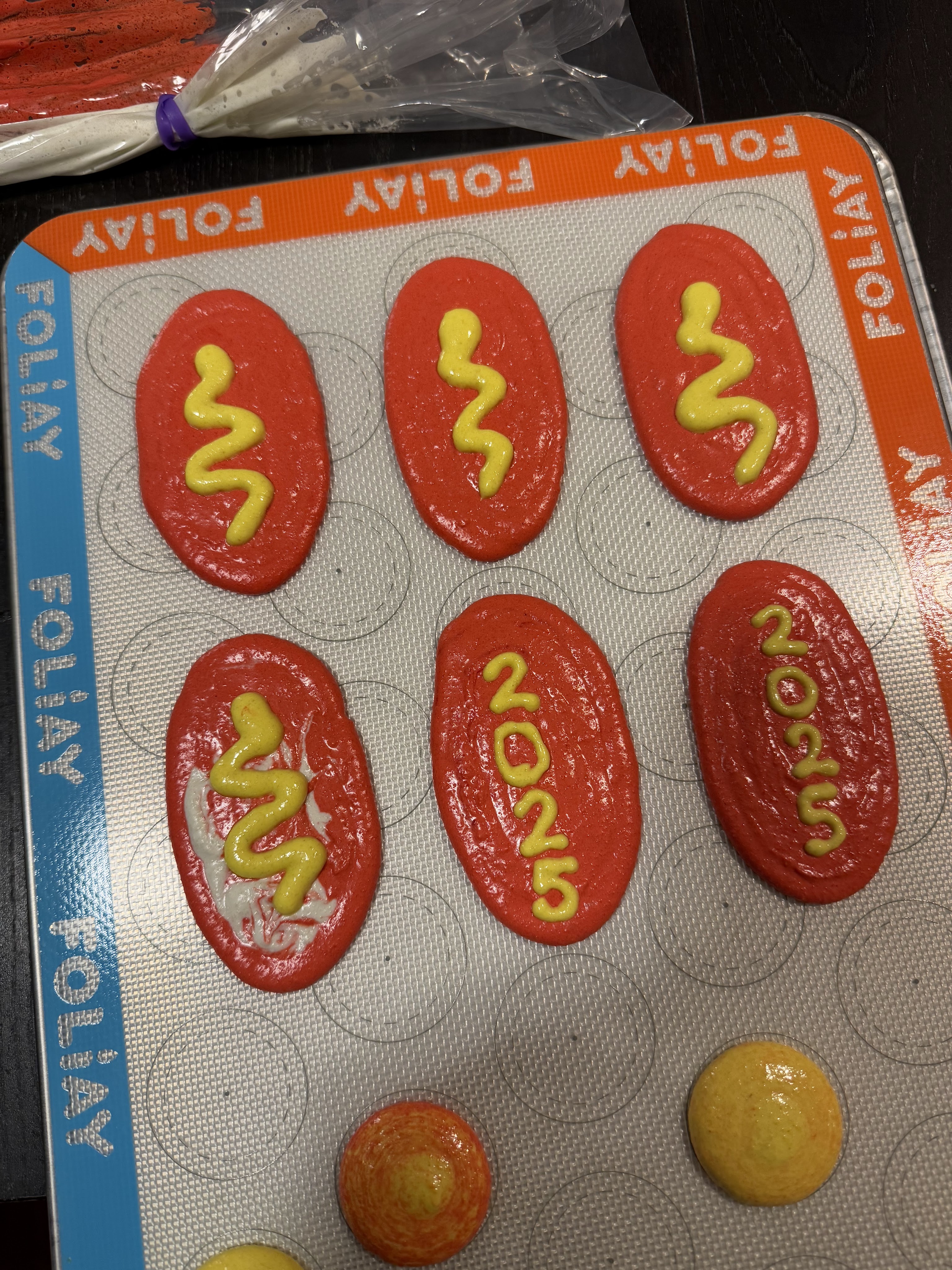 - Pipe the yellow batter on top of the red batter. I did a snake and 2025 on the top.