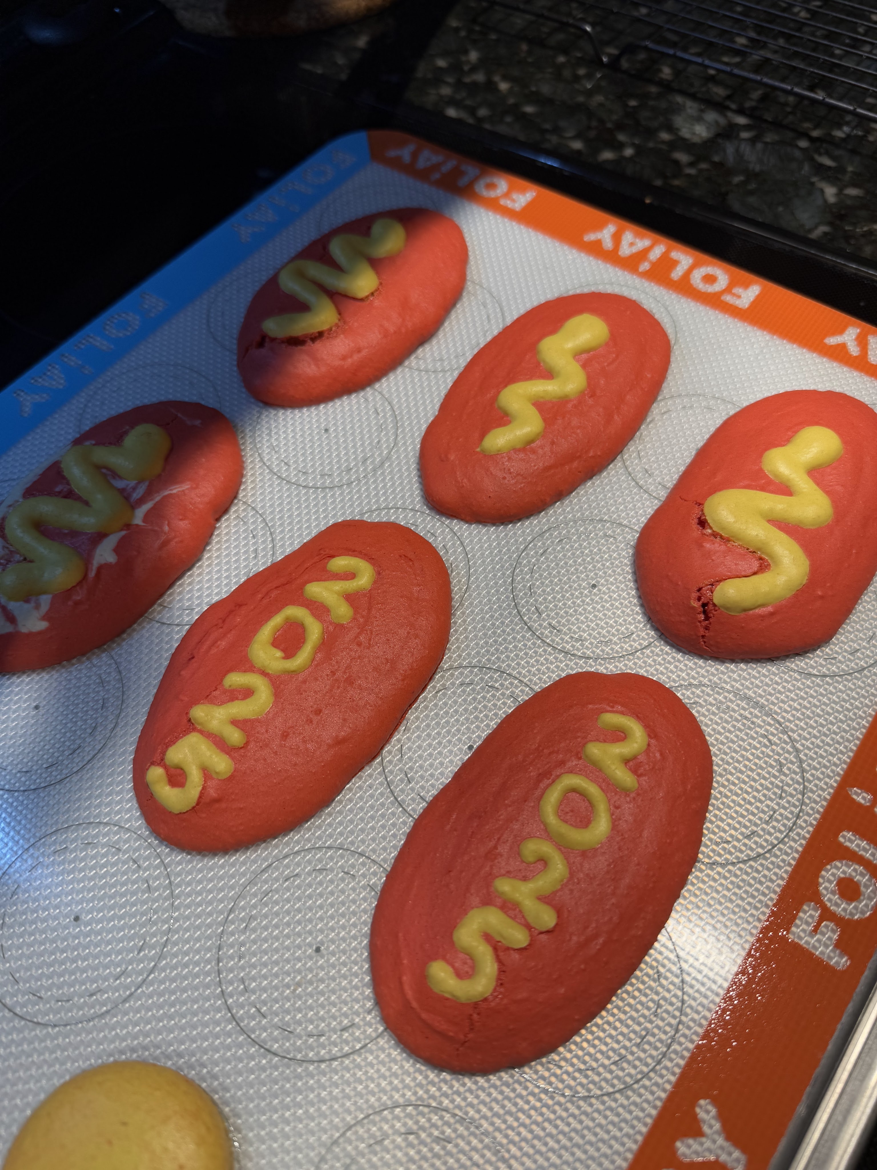 - Rest the shells about 45 minutes -1.5 hours, depending on how humid where you live. I rested for an hour after adding the yellow batter on top and few still cracked :(.