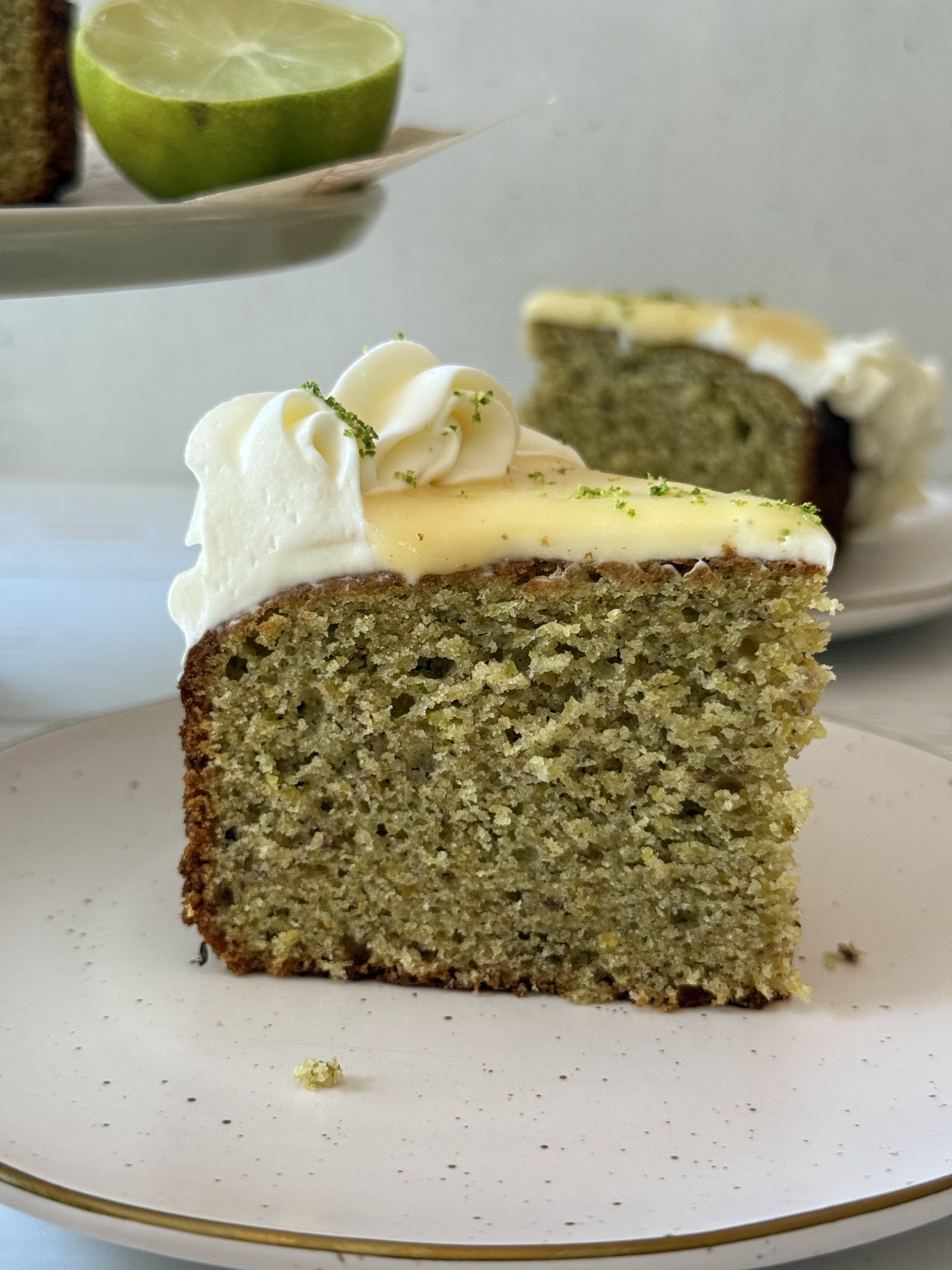 This gluten free lime pistachio olive oil cake is light and moist! You will be surprised how delicious it is with whipped cream cheese frostin and lime curd on top.