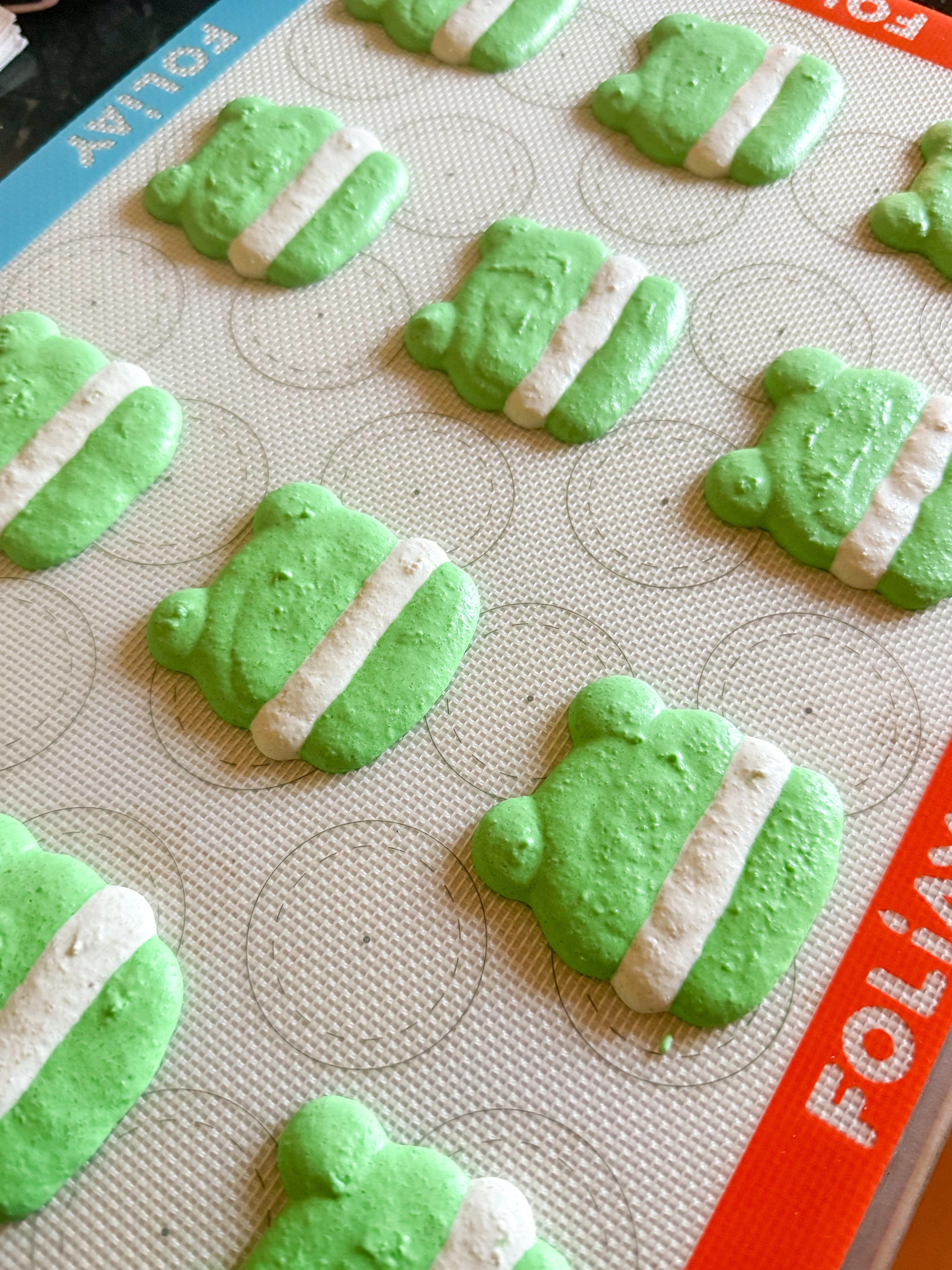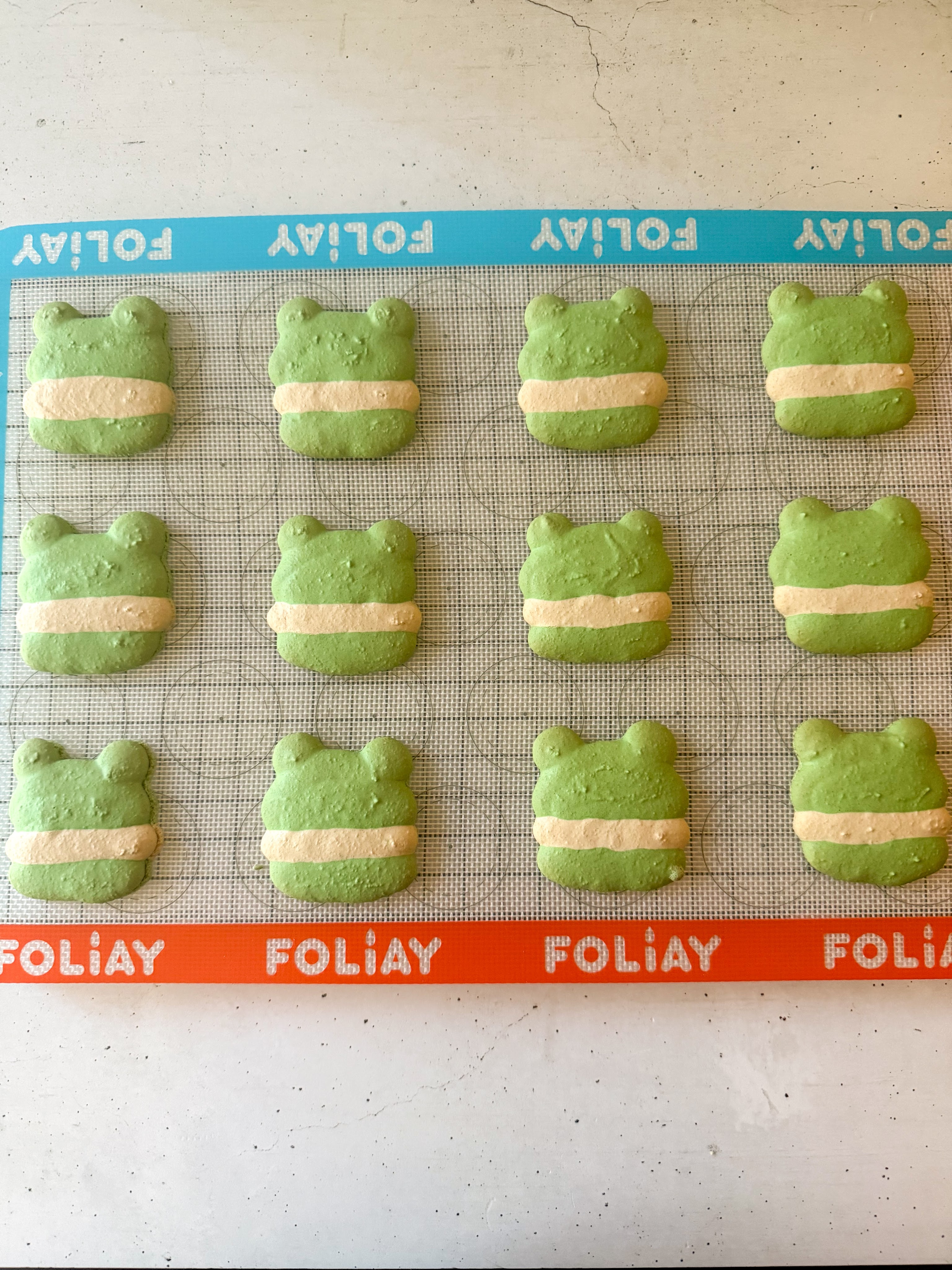 - To pipe the frog macarons, pipe the frog first, leaving the white space in between sections. Then let that piped batter dry for a few minutes before piping the white batter to it.