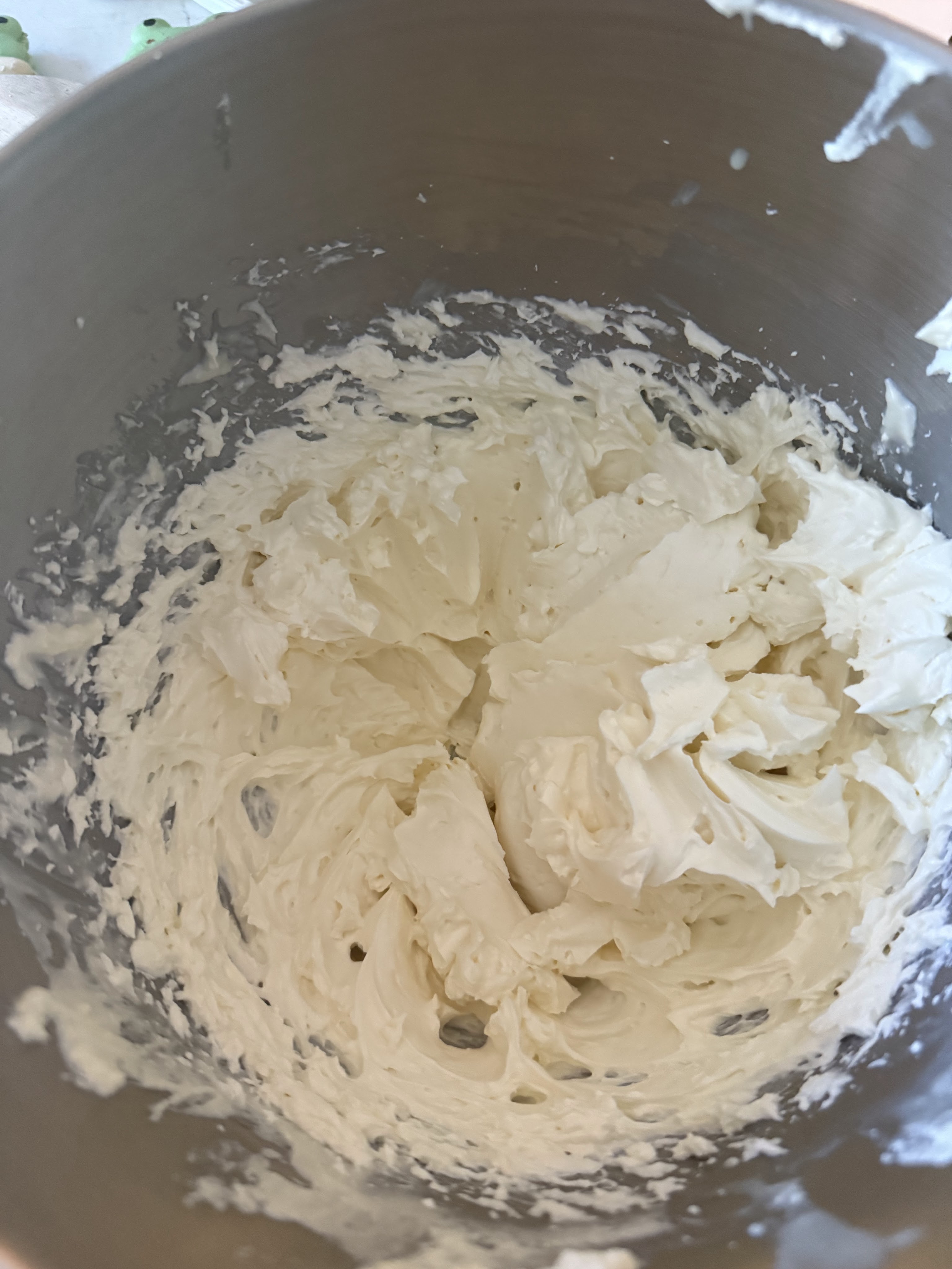 - When ready, transfer the batter to two piping bags. One for green and one for white.