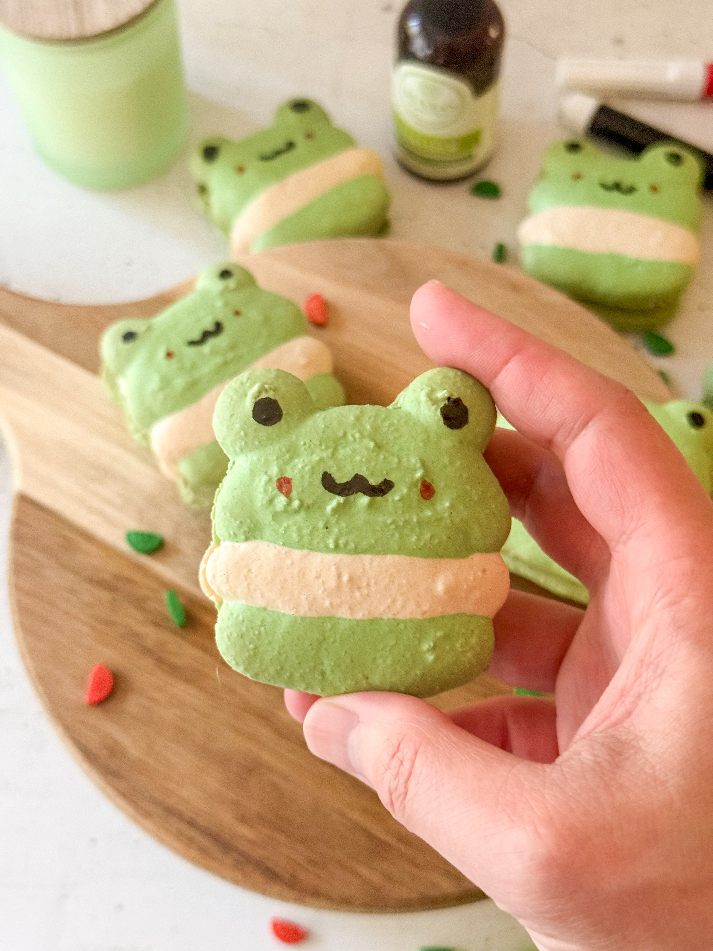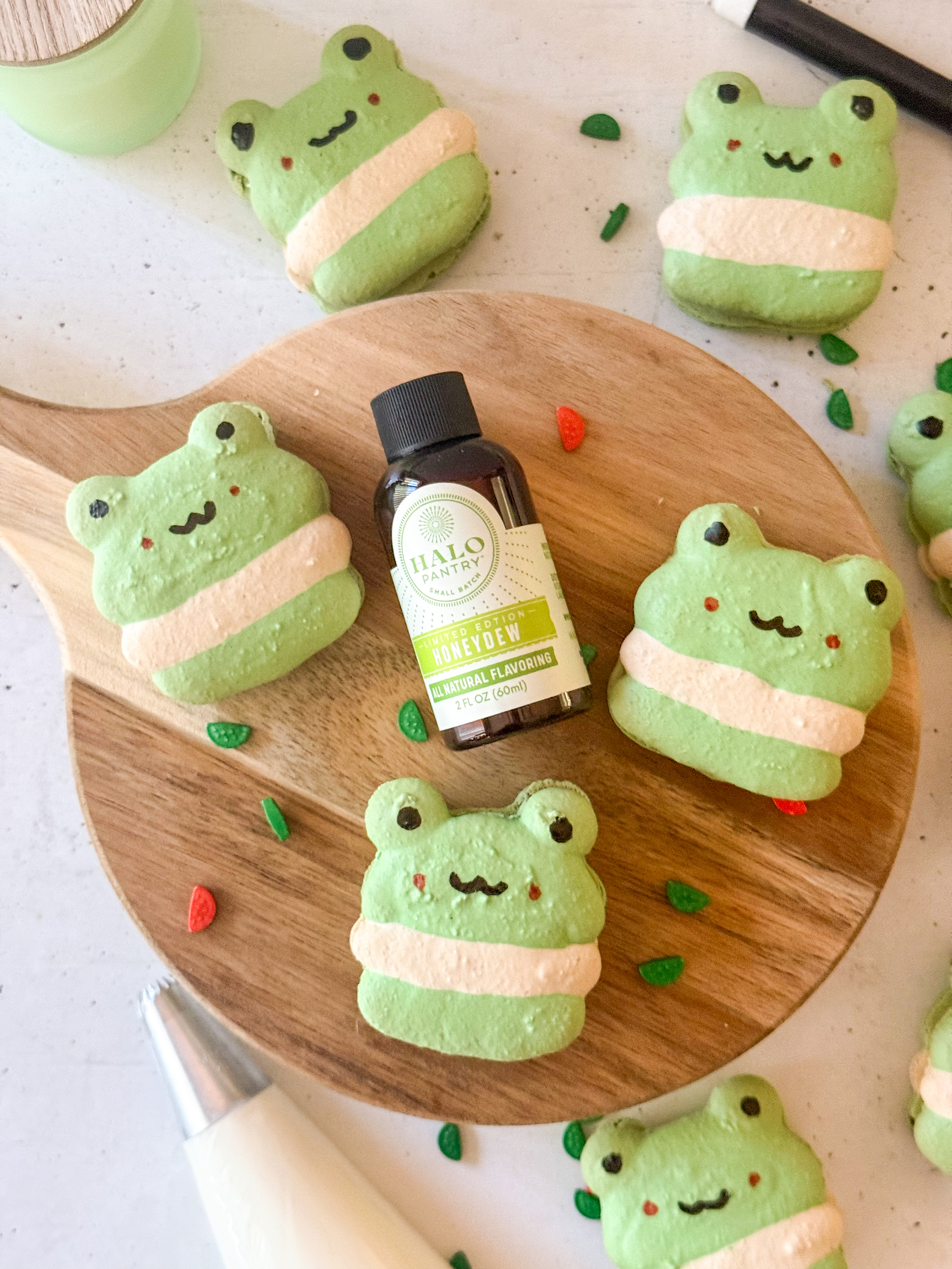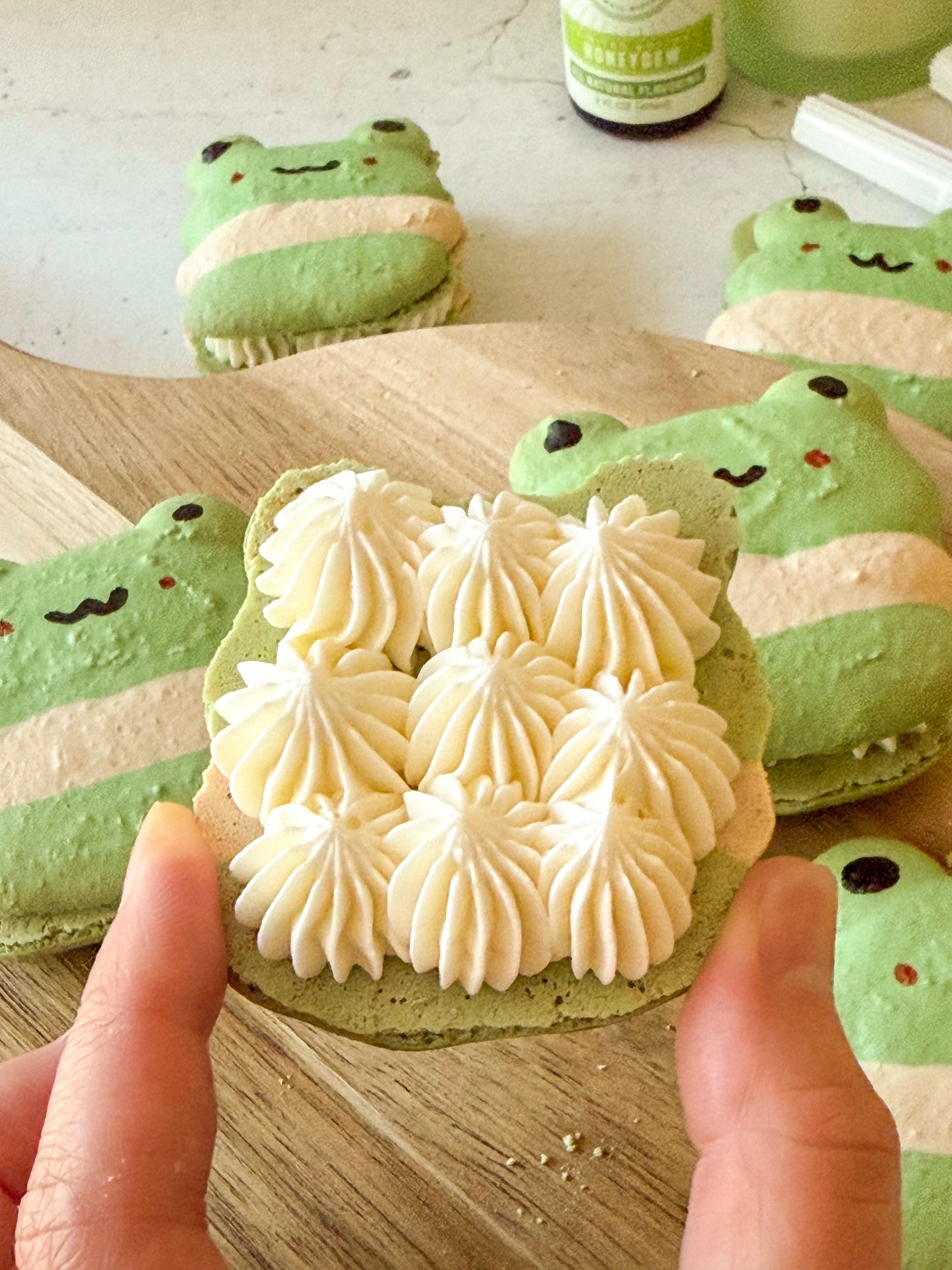 Frog macarons are filled with honeydew Russian (condensed milk) buttercream. If you like the honeydew, you will definitely love this! Aren’t these frog macarons so cute?!