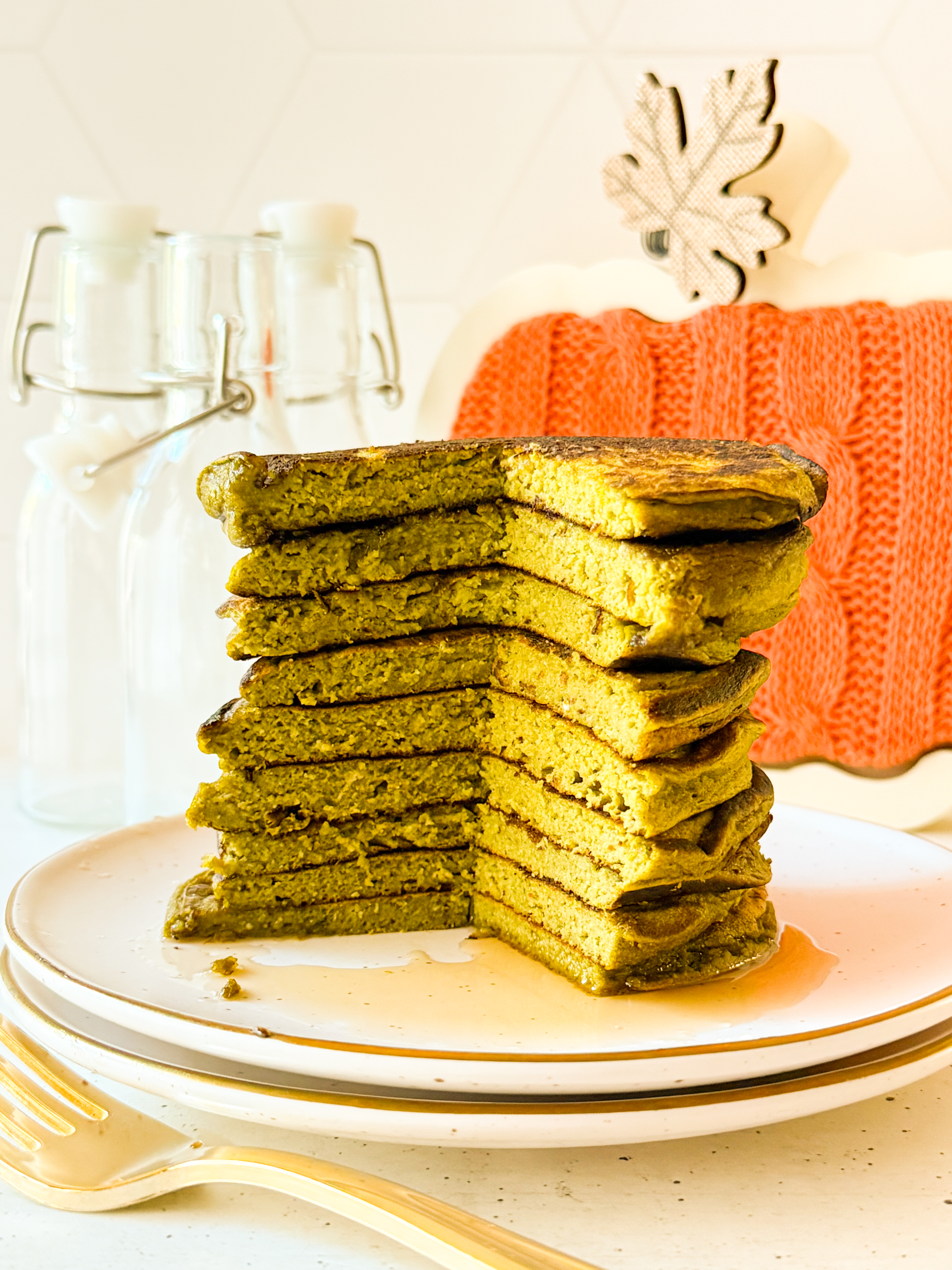 These easy oat flour matcha pumpkin pancakes are packed full of flavor! With rich pumpkin, warm spices, and just the right amount of sweetness, they’re the perfect breakfast dish for crisp, cool fall mornings!